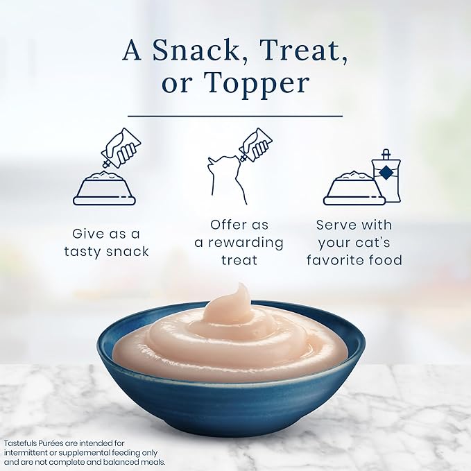- Contains: Twelve (12) 3-oz pouches of BLUE Tastefuls Purées Natural Cat Food Complement, Chicken