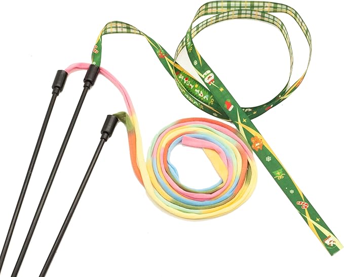 - 3 pack cat teaser wand with Christmas Ribbons, improve cat’s catching ability and exercise its interest.