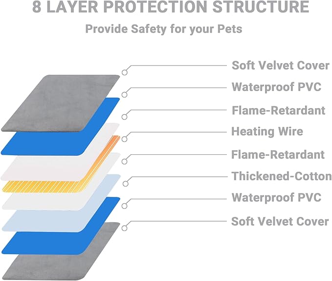 - Safety and Secure Structure: 8-layer protective structure pet heating pad is made of soft velvet cover, waterproof & retardant PVC enclose, thickened cotton and heating wire; The pet heating pad has a built-in smart temperature sensor to prevent overheating and protect your pet; Keep the pet pad flat when in use (do not fold)