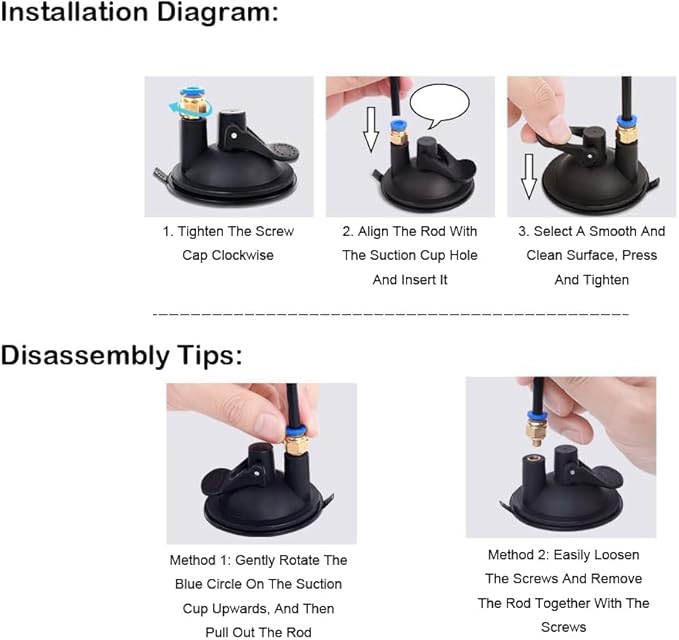 - Usage Tips: Keep The Adsorption Area Smooth, Clean, And Free From Moisture. 2.3. After Fixing The Suction Cup, Minimize Movement As Much As Possible And Do Not Use It In High-Temperature Environments, As This Will Irreversibly Affect The Suction Force. 4. If The Suction Cup Is Not Sticking, Please Clean It With Clean Water And The Suction Cup Will Stick Back Together.
