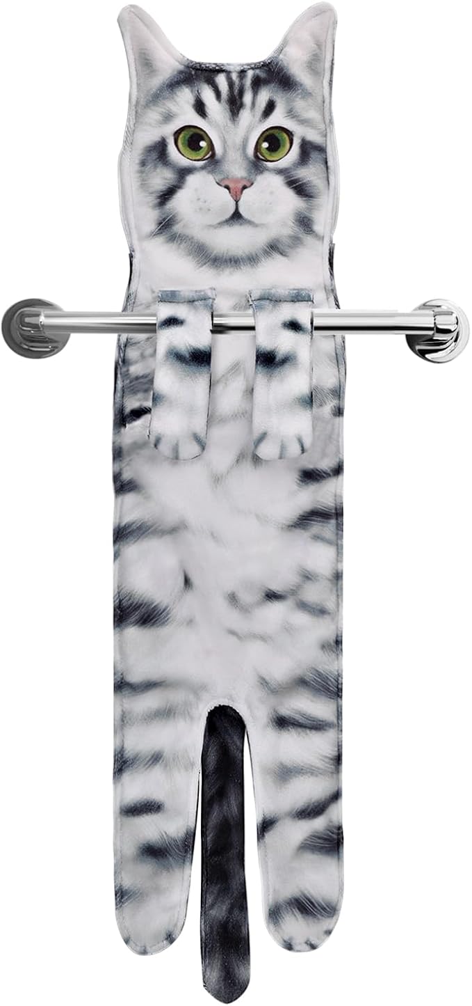 - Funny Cat Hand Towel:When you wipe your hands with the feeling of touching a cat's belly,you will be healed by the soft fabric touch!The pattern on the back,tail and paws are very realistic,so cute that even the towels also make you want to hug them!Funny cat towels hanging on a towel rack,the snap button of the cat's hand prevents the towel from slipping off.
