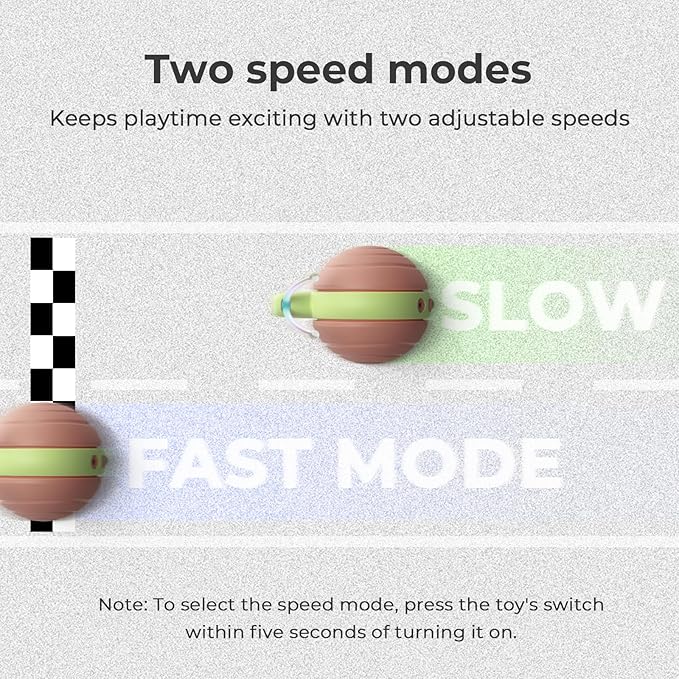 - 【2 Speeds Modes Adjustable】Wicked Snail offers two speed settings,the green lighted band for slow mode and a blue lighted band for fast mode. You can adjust the speed to suit different cats' preferences. Tip: Long press for three seconds to turn on!!! You can select the mode by pressing the power button of the toy within five seconds of turning it on.
