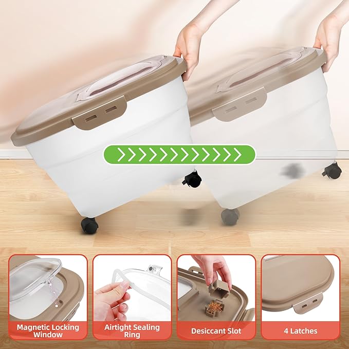 - KEEPS KIBBLE FRESH: Sealed by 4 latches and silicone sealing ring, the pet food container is airtight to keep the kibbles dry and fresh, and the desiccant slot inside the lid will also help to keep the food dry and keep the pest out. The 4 detachable rolling wheels make it easier to move around the container even when it's full, and it lifts the rice container up to aviod the moisture from floor.