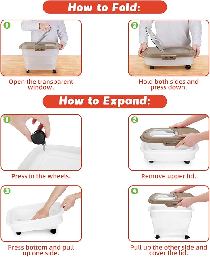 - SAVE SPACE: It's your choice to make the cat food storage container small or large. The expanded size is 16.5in * 11in * 12in, can hold 20-25lb dog/cat dry food, and the folded size is 16.5in * 11in * 5.5in, can hold 6-8lb depand on the cereals it hold. When the dog food holder is half empty can collapse the container down for space saving, and also convenient for taking for travel.
