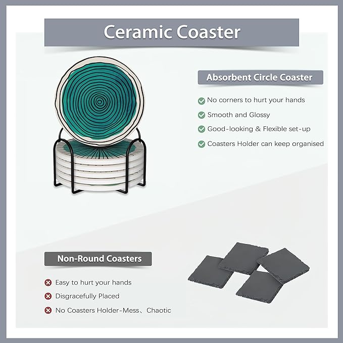 - 【Water-absorbing Ceramics】These coasters are super water-absorbent, the cork back can avoid scratching your furniture and prevent coasters falling off the table.