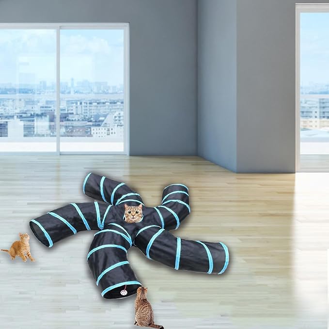 Cat Tunnel Tube Toys,Tunnels for Indoor Cats, 5 Way Blue Collapsible Interactive Toy with Balls for Rabbits, Kittens, Ferrets, Puppy