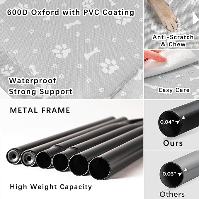 - Sturdy & Resilient: The robust 600D Oxford with PVC Coating resists scratches and chewing, delivering exceptional support with even pressure distribution to alleviate joint and muscle discomfort. The lightweight metal frame, tested for strength, can comfortably accommodate dogs weighing up to 75 lbs.