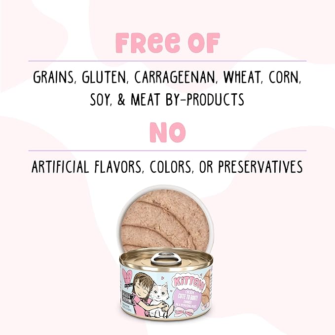 - B.F.F. Kitten Cute to Boot, 2.8 oz Can (Pack of 12) Featuring cage free chicken and dried egg.