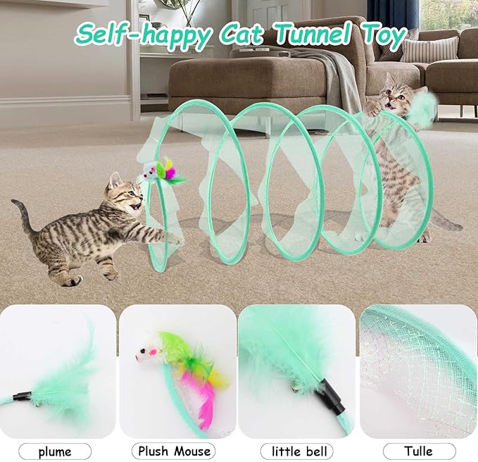 - Appealing Design: This coil cat toy features an S-shaped design, offering physical and mental stimulation for your feline friend. The sides of the cat tunnel is adorned with plush mice and feather or sisal ball toys, igniting your cats's curiosity. Cat tunnels for indoor cats suitable for various small animals.