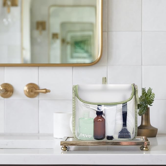 (re)zip Zippered TSA-Compliant Travel Quart Bag | Zippered, Reusable, Storage Bag for Toiletries, Makeup, Suitcase Organization | BPA-Free, Food Grade, Machine Washable (Clear, Sage Piping)