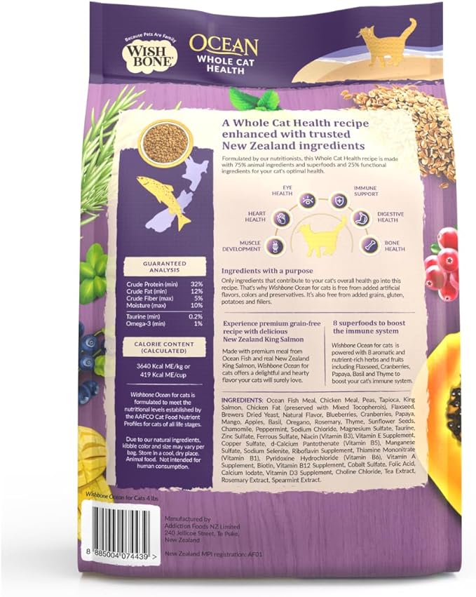 - SUPPORTS OVERALL PET HEALTH: Wishbone Ocean New Zealand King Salmon Dry Cat Food provides a complete and balanced diet crucial for your cat's overall health. Every nutrient, vitamin, and mineral is carefully selected to ensure your cat receives all the essential elements necessary for optimal health and well-being. From supporting a healthy weight to promoting proper digestion and providing energy for play, this formula covers all aspects of your cat's health, ensuring they thrive.