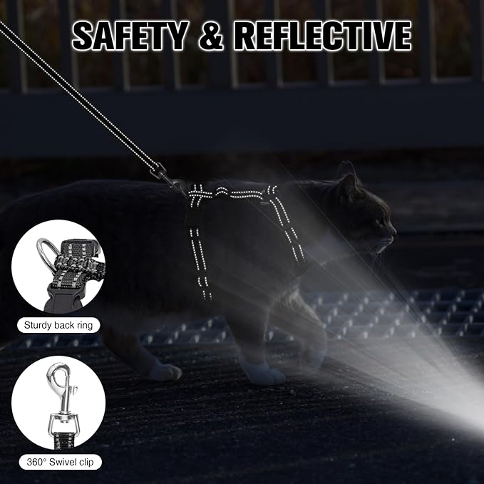 - [REFLECTIVE CAT HARNESS] The reflective trims of the pet vest harness and leash ensure good visibility at night, safe and fashion while out for a walk; This cat harness and leash for walking escape proof is ideal for daily walking, jogging, training, and any outdoor recreations. Also a great cat harness when you're taking your kitty to an unfamiliar place, such as the vet or groomer.