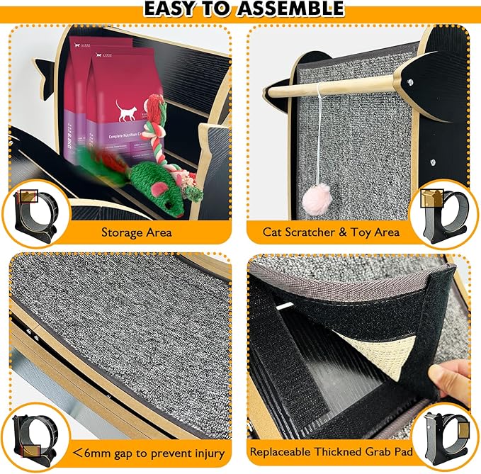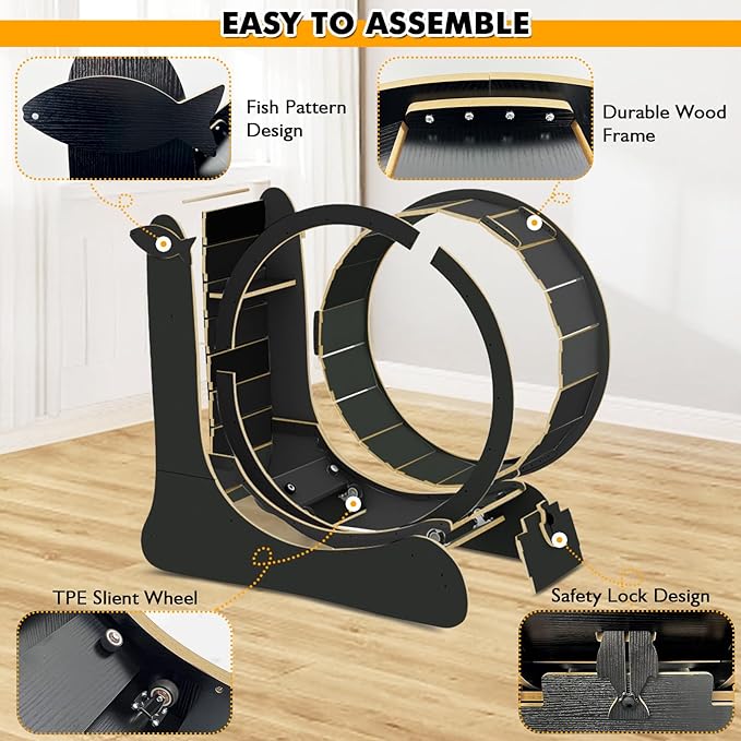 - 【Durable Material & Assemble Easily】The cat exercise wheel dopts sturdy and durable wood material. The <6mm gap between base and roller can protect cats from getting injury. All reserved holes are set on the surface of the product to facilitate installation. You can complete installation within 1-2hours wtih instruction manual. Meanwhile, the cat running wheel also have cat scratcher area and toy area, it can help cat keep active and healthy.