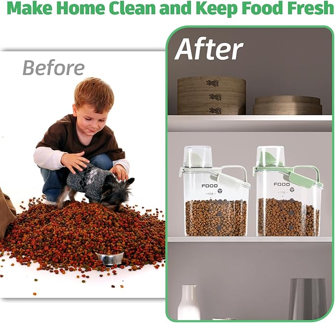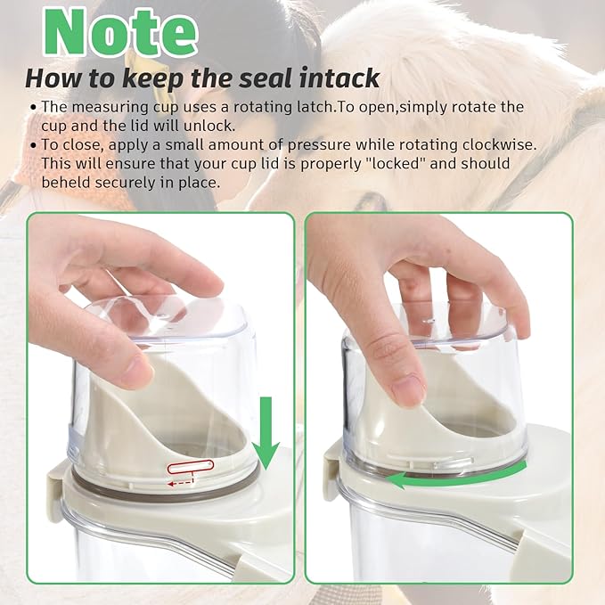 - 【Easy Pouring】Pet food container with pour spout large pour spout opening and measuring cup design provide a happy pouring feeling, making every pouring convenient and clean. This small dog food container have transparent body you can clearly see the capacity of the food stored inside.