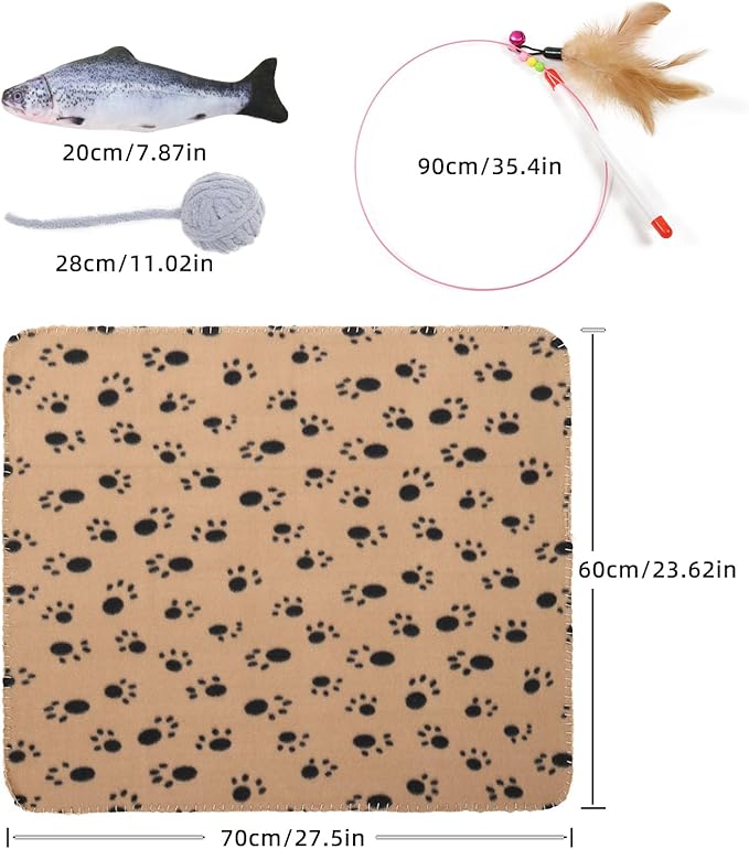 - 【Cat Toys Set】: Contains 1*cat tunnel, 1*cat track toy, 1*cat amusing stick, 2*two brightly colored bell balls, 1*yarn ball with bell, 1*catnip cat toy Simulated fish and 1*pet blanket。A variety of toys for your cats, many options to choose from. Integrate a close relationship between you and your pets while interacting with them