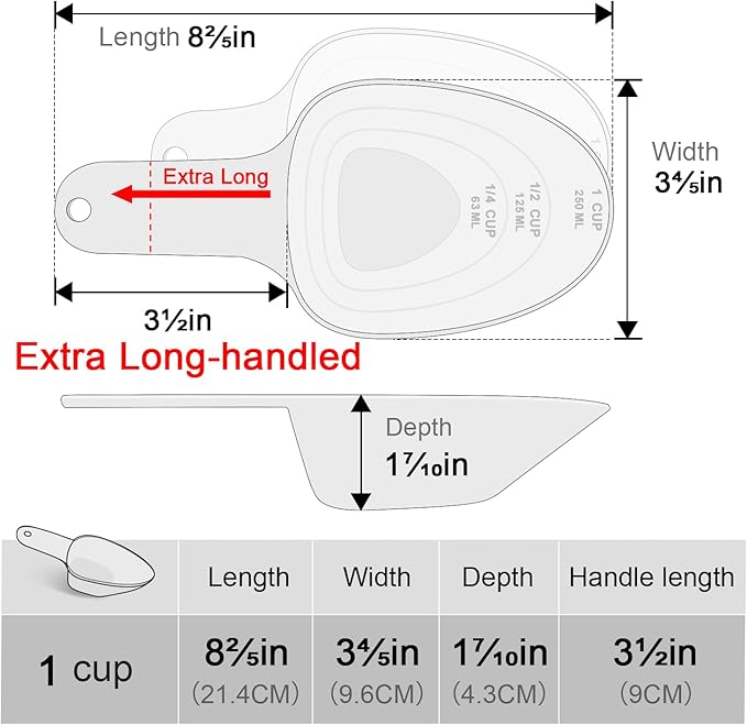 - [ PRECISE MEASUREMENT ] - The pet food scoop is labeled with three capacity markings inside (1 cup, 1/2 cup and 1/4 cup). It can be used to accurately measure the proportions of pet food to create a standard diet.