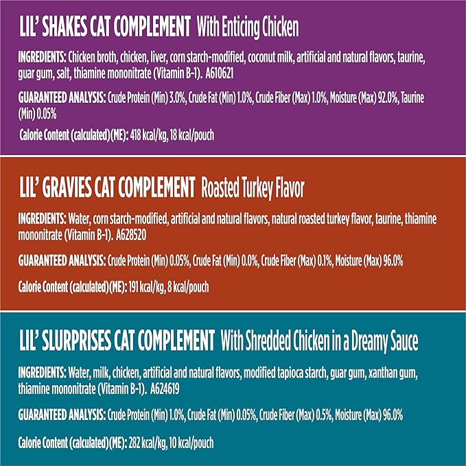 - Cat food topper variety pack in enticing chicken or roasted turkey cat food complement flavors