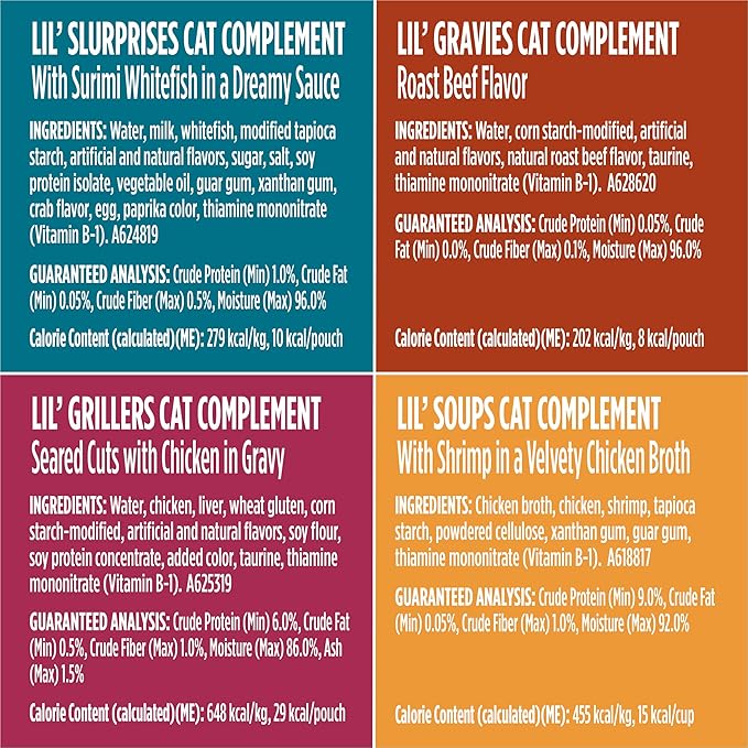 - Cat food topper variety pack in tasty shrimp, ocean whitefish, roast beef or chicken cat food complement flavors