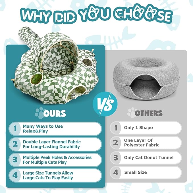 - Cat Tunnel and Cat Bed - OUHOU cat play tunnel is a combination of cat bed and donut tunnel to meet the needs and desires of pets to play,nap, run,hideaway,relax and sleep.