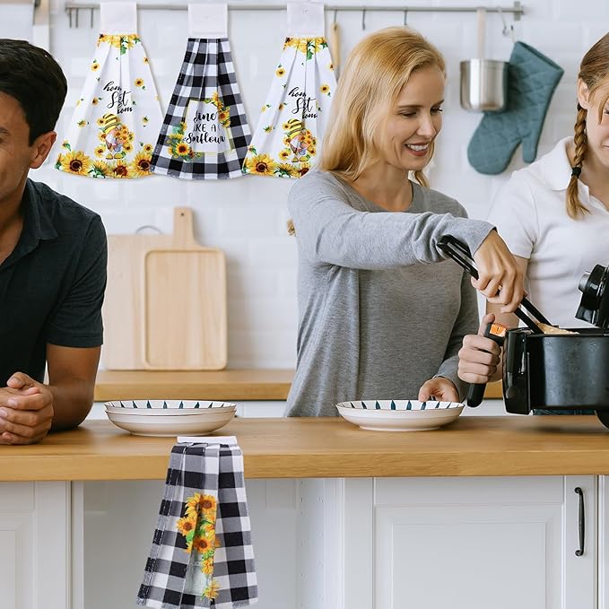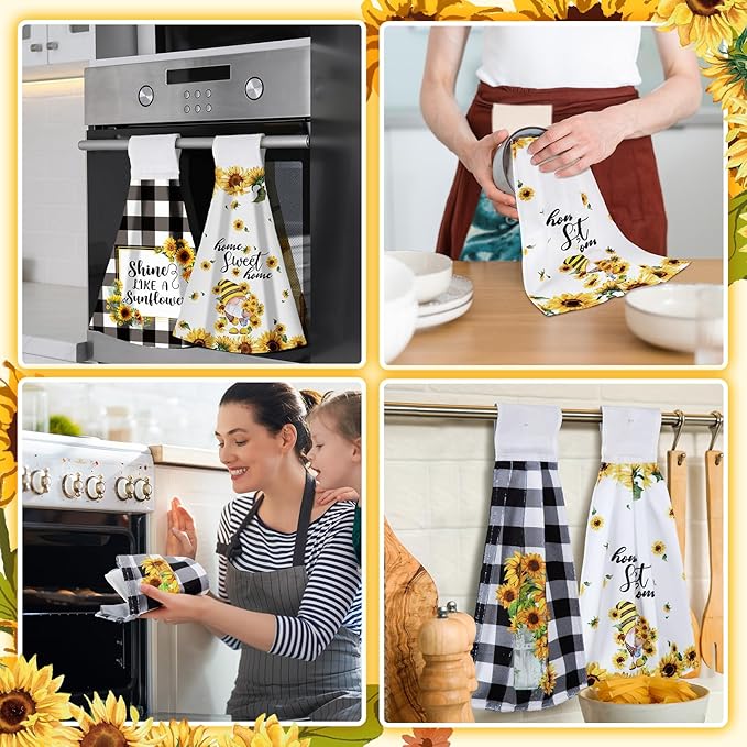 Sratte 4 Pcs Sunflower Hanging Kitchen Towels Hand Towels with Hanging Loop Summer Buffalo Plaid Gnomes Sunshine Dish Towels Bath Absorbent Oven Stove Wash Cloth for Home Decorative Housewarming Gift