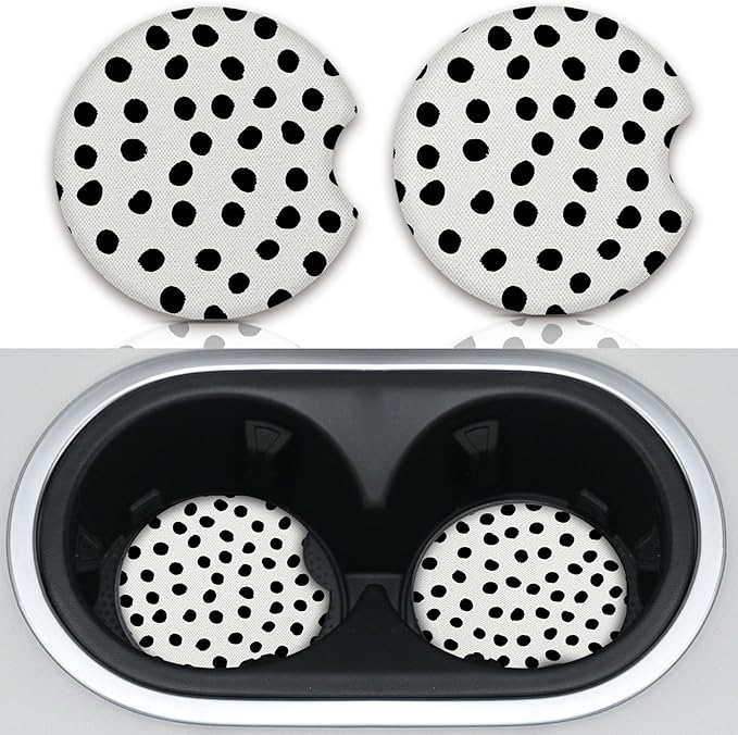 Car Coasters for Cup Holders,Cute Car Accessories for Women Interior,Cute Auto Accessories Gifts Cute Black Polka Dot,Pack of 2 2.75inch Drink Cup Car Holder Coasters with A Finger Notch