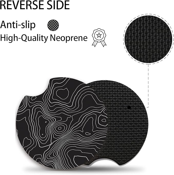 Black Contour Map Cute Cup Holder Coasters,Car Coasters for Cup Holders,Cute Car Accessories for Women Interior, 2 Pack Absorbent Universal Neoprene Car Coasters with Finger Slot