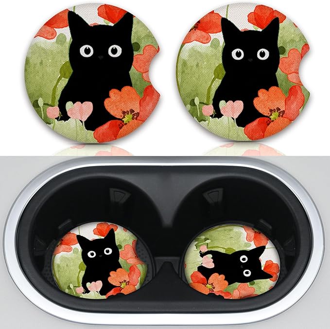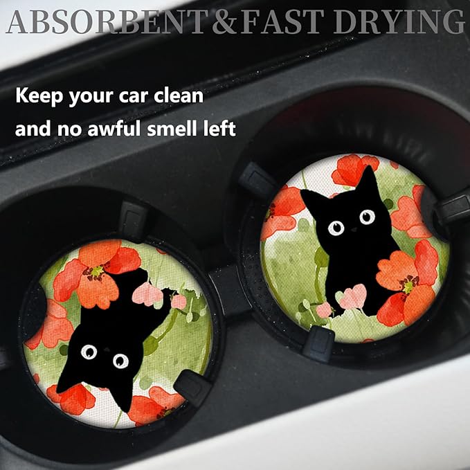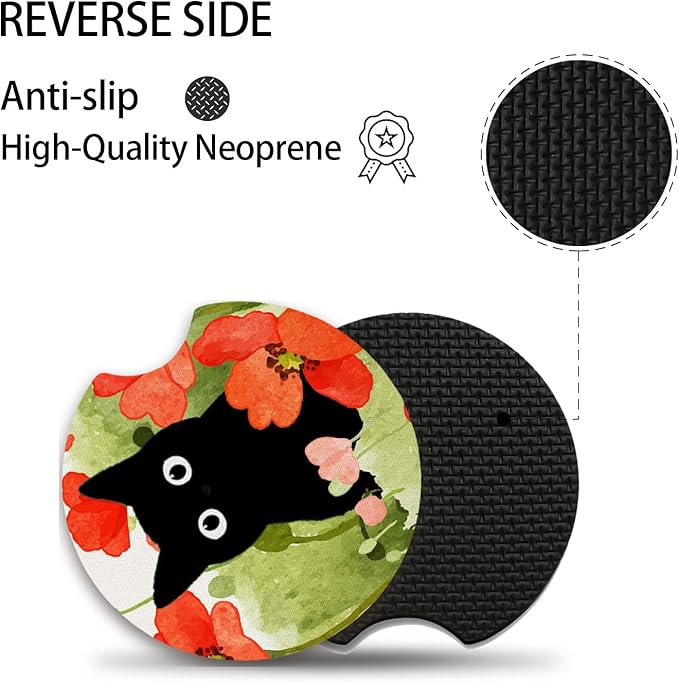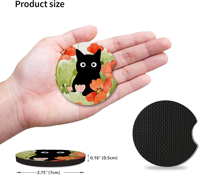 Car Coasters for Cup Holders,Balck Cat Cute Car Assecories for Women,Pack of 2 Cup Holder Coasters for Car,2.75" Anti Slip Rubber Car Cup Mat with A Finger Notch.