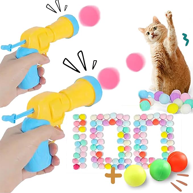 Interactive Cat Toys for Indoor Cats Includes 2 Cat Toy Gun + 100 Cat Pom Pom Balls + 3 Extra Balls | Cat Ball Launcher Giving Your Cat Fun and Exercise