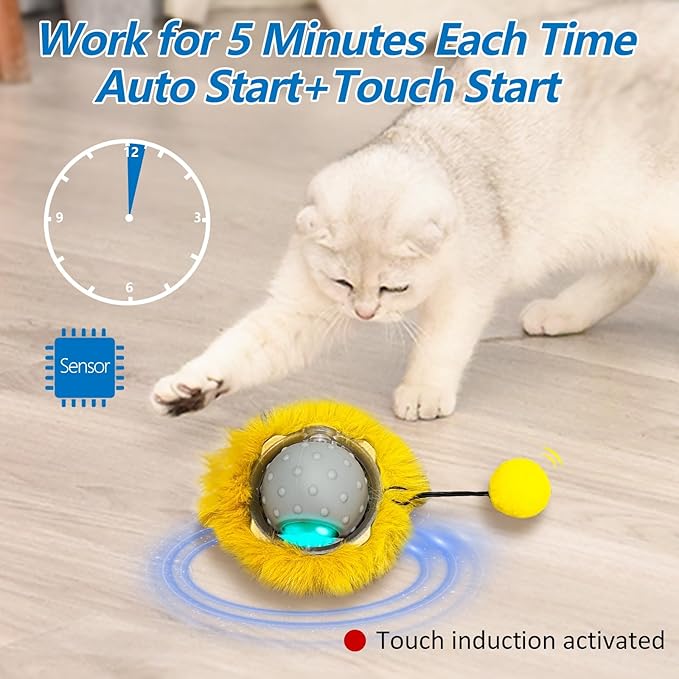 - Automatic cat toys: 5 minutes of operation, the electric cat ball toys will automatically stop for 1 hours. During this time, it can be restarted by touching, and then run again for 5 minutes; If there is no touch to start within 1 hour, the electronic cat toys will automatically start for 30 seconds and then continue to enter standby mode, and so on