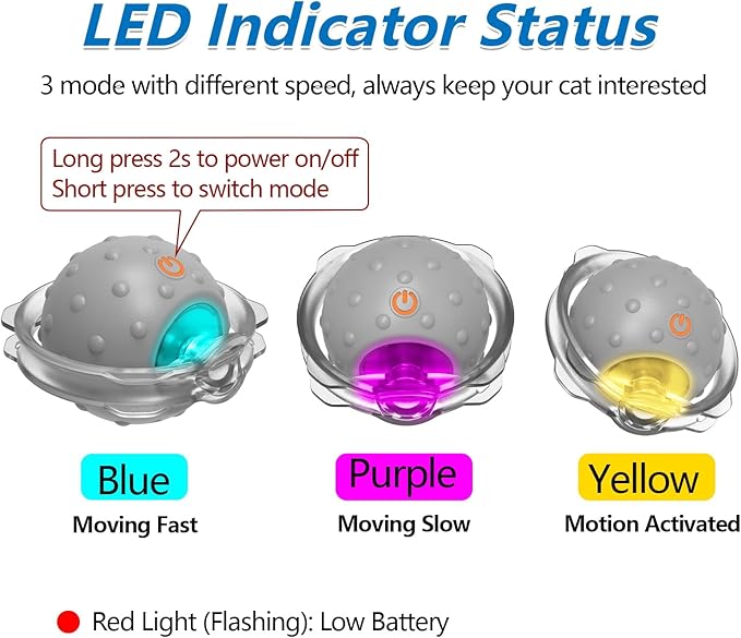 - Smart interactive cat toys: This robot cat toys has 3 motion modes, fast running-blue light/slow running-purple light/interactive mode-yellow light, which can meet the needs of different cats, It is suitable for Tile floor/Marble floor/Wooden floor/Carpet/Wool carpet, ect