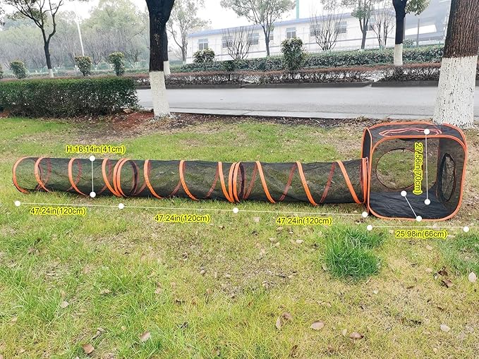 - Portable & Easy Set Up:Pop up design,easy quick open,can be fold into a carry bag,only weight 8.15 Pounds,very convenient for camping,beaching,picnic,or motor home traveling.Each tent/tunnel can be attach by zipper,also easy to disassemble.You can enjoy pet's funny time anywhere.