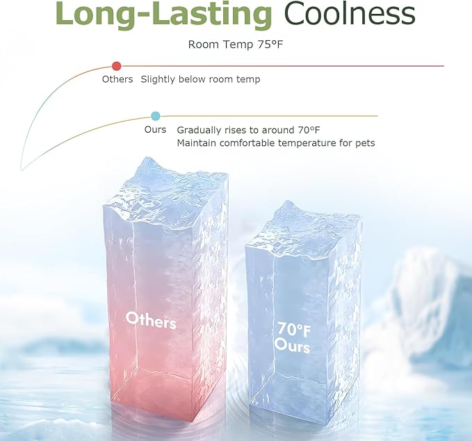 - COOL WITHIN 3 SECONDS OF TOUCH : Surface of cooling mat adopts the cool touch fabric (Qmax greater than 0.4) , can effectively cooler by 3-5°C (5-9°F). Compared to other regular cooling mat (Qmax about 0.16), it increased coolness by 60% and effectively prevents pets from overheating