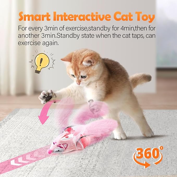 Migipaws Automatic Cat Toys, Plush Cat Mouse Toy, Interactive Toy for Indoor Cats, Smart Moving Kitten Toy, Rechargeable (Pink)