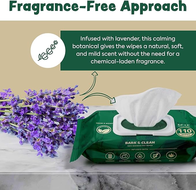 - These lavender dog wipes are infused with soothing and moisturizing ingredients like lavender, shea butter, vitamin E, coconut oil, and aloe making them perfect for dogs with sensitive skin.