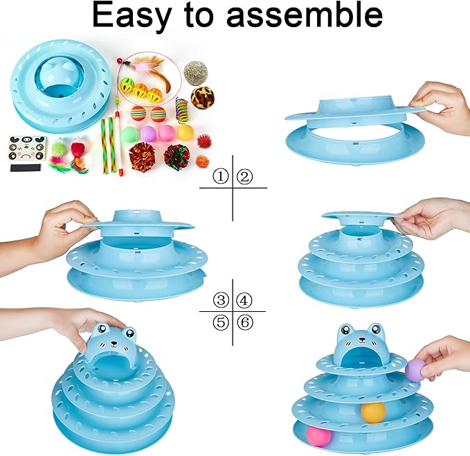 - INTERESTING CAT TOY - This tower cat toy consists of 4 layers, and with 4 different coloured balls that are located in the tracks. The spinning ball on the track stimulates the cat’s senses and hunting instinct. You can also choose to put bell ball into each layer, which can attract cats to play more. The cat can play alone, eliminating the cat’s boredom and depression.