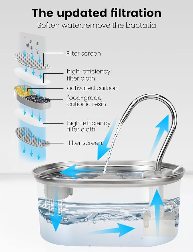 - Upgraded Design: The upgraded version of this pet water dispenser features additional filtration layers, and provides better filtration performance, delivering clean and fresh water to your pets
