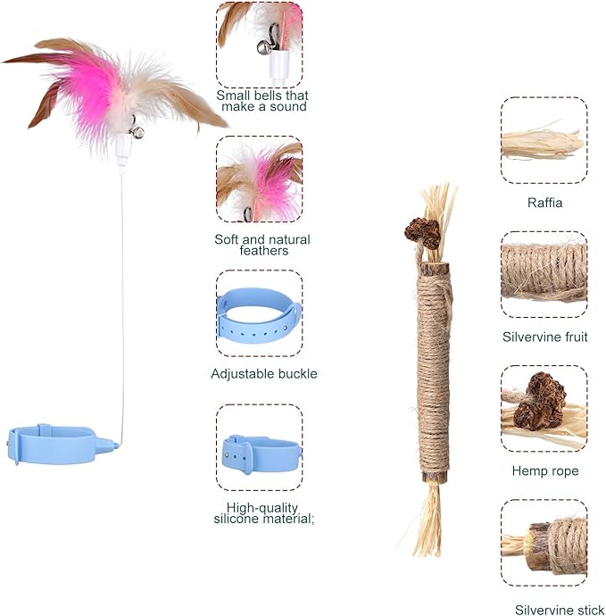 - Package Content: You will receive 2 pieces of collar cat toys and 3 cat teasing wands. The sound of the bell and feathers will attract cats' attention and stimulate their hunting instincts.