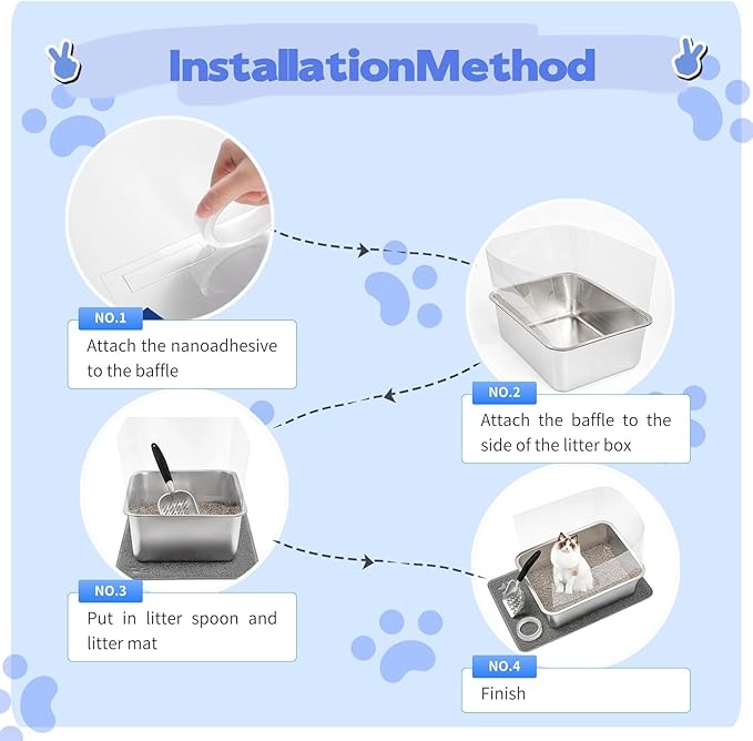 - Value Litter Box Set: This set includes 2 stainless steel litter boxes, 2 litter mats, 2 metal spoons, 6 clear plastic shields and 1 roll of nanoglue. Two sets of metal sand boxes for your replacement and cleaning needs, also suitable for homes with several cats.