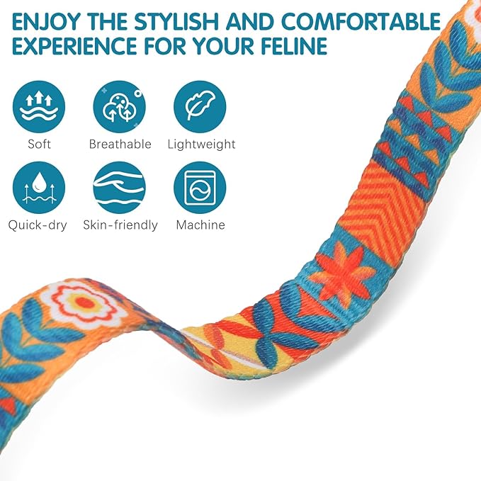 - 🏵️SOFT,LIGHTWEIGHT MATERIAL: This stylish and practical cat harness and leash set is made of high-quality polyester, soft to the touch, breathable and skin-friendly with smooth, flat edges that won't scratch your cat's skin. It's lightweight and durable suitable for leisure walking, travel, training, treatment, and other diverse occasions, machine washable, and easy to clean. Bright contrasting colors and unique pattern designs make your kitten stand out in no time!