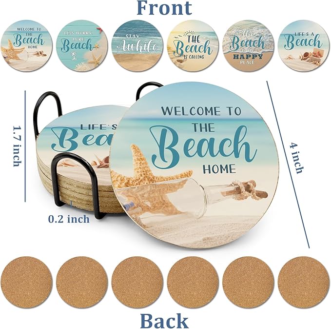 - 【CUTE & PRACTICAL HOME DÉCOR】This beach coaster set with holder will look great as home décor in your kitchen and living room! They also look cute as coffee table décor! The best thing about these cup coasters is that not only are they cute kitchen and home accessories and decor,Can also be used as decor for beach, coastal, ocean and tropical themed home