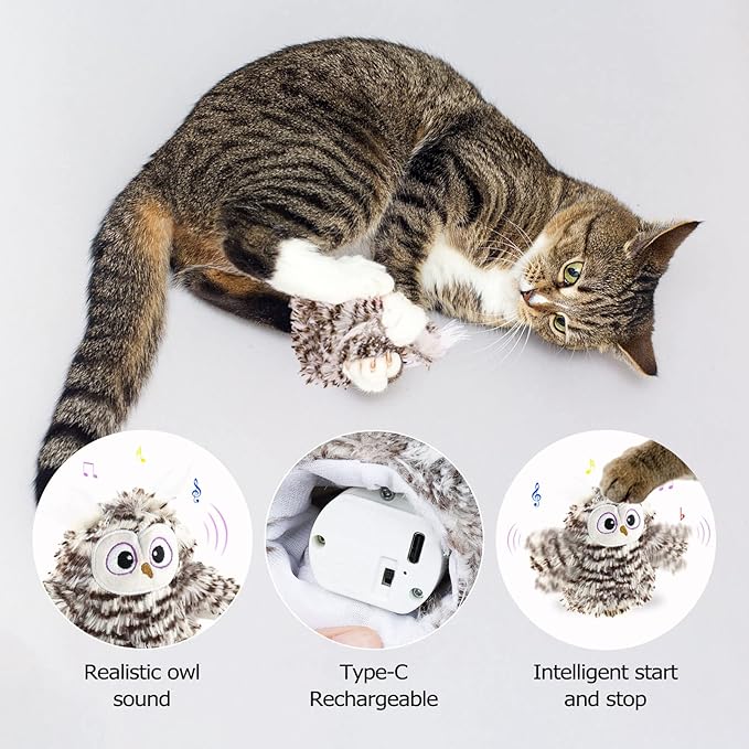 - Mental & Physical Stimulation: 3 modes of flapping wings to meet the different interests of cats. For your indoor kitten who would love to catch real owl- the cat owl toys are quite the hit. They would feel like they had caught a real owl to proudly strut around with it in the mouth or toss the cat plush toys in the air.
