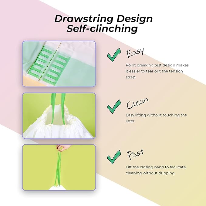 - Drawstring Design, Easy to Use: Self-clinching and Leakproof cat trash bags make cleaning litter a cinch. No More Messes, No More Scrubbing, No Odor. When it’s time to change the litter, just lift litter bags ties, close and throw away. Cat owners can finish clean kitty litter box within 30S