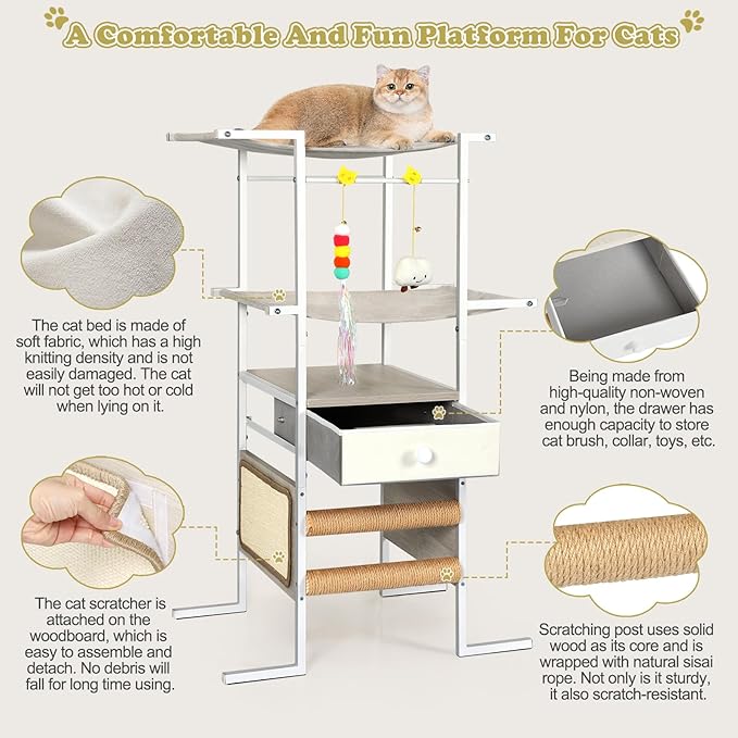 - 【Multi-Level Modern Cat Tree with Drawer Storage】: The design of cat scratching post with bed provides vertical platform for cats to sunbathing, climb, scratch, play and rest, expanding their active space indoors to satisfy their natural instincts and needs. Plus, our cat tree includes convenient drawer storage, ensuring essentials like cat brushes, treats, collars, and more are neatly organized and readily accessible.