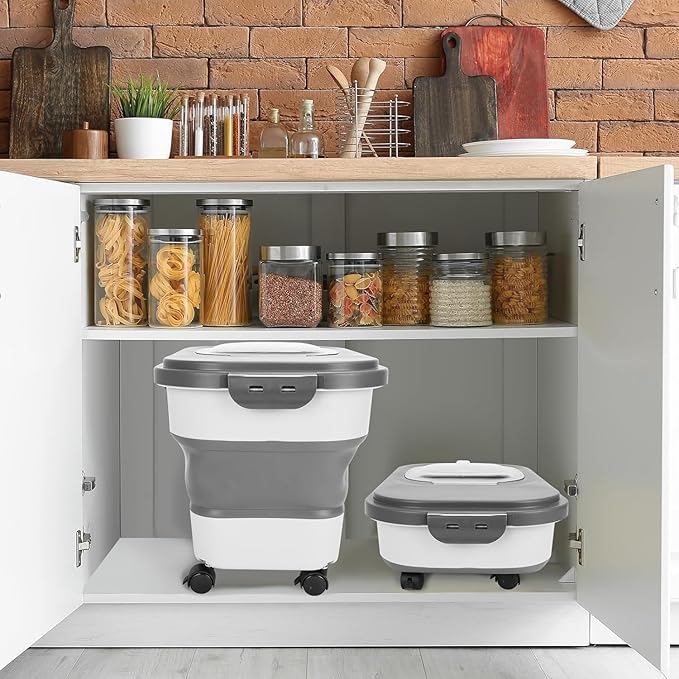 - 𝐂𝐨𝐥𝐥𝐚𝐩𝐬𝐢𝐛𝐥𝐞 𝐃𝐞𝐬𝐢𝐠𝐧 to Save Space >>>> Our dog food container is foldable & collapsed when not in use, saving valuable space in your kitchen or pantry