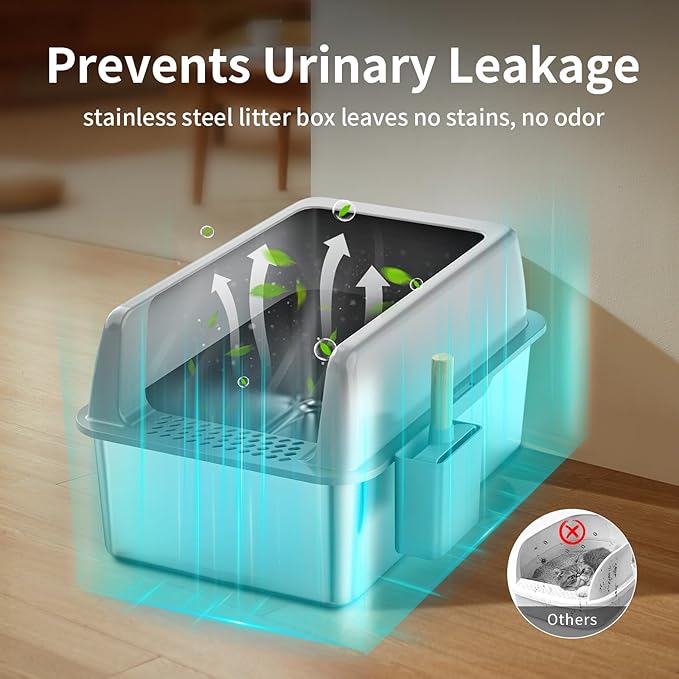 - 【14.3 Inch High Side Enclosure Cat Litter Box】: With an upgraded 14.3 inch height, it's the perfect size for both big and small cats. Additionally, our stainless steel cat litter box features high sides to prevent litter from scattering around your home.