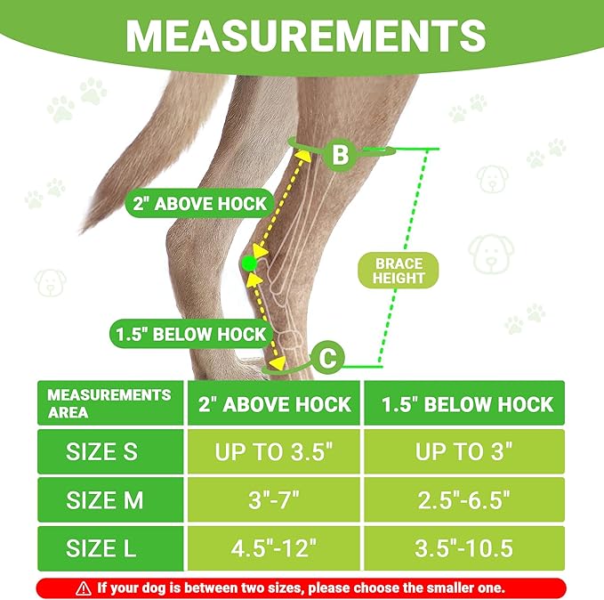- PRECISE SIZING, EASY FIT: Ensure the perfect fit for your dog hock support with our comprehensive sizing guide! Measure the leg circumference above and below the hock point and consult our size chart for the correct size before making your selection. It's the key to optimal support and comfort