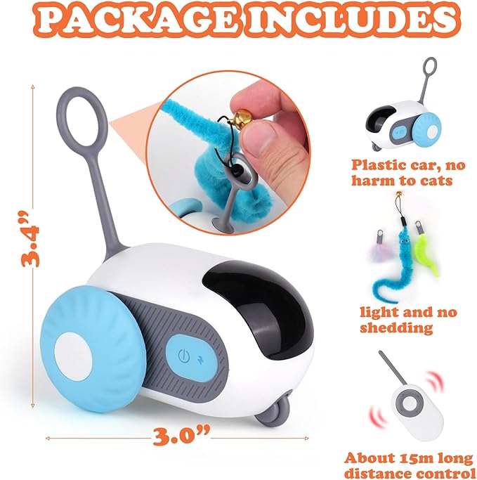 - Cat Love Set: The fast-moving car design is inspired by the hunting instinct of cats. The long blue tail design is inspired by the color blue in the cat world. The beautiful and light tail is installed on the remote control cat interactive toy car. When it moves like a mouse, it attracts the cat's attention even more