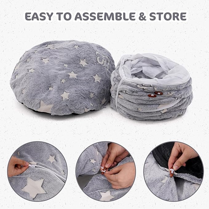 - 【Many Ways to Use】This cat tube can be turned into a circular,semi-circular,or a S-shaped shape. providing cats with various ways to play. Its circular shape add the additional level of agility and bring more adventure. Additionally, the cat tunnel is made of unqiue luminous fabric, which can glow in the night.