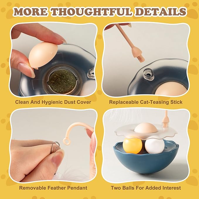 - Entertaining Cat Toy: Interactive cat toys is with a tumbler design, allowing the funny toy to interact with your pets. The teaser with feather and bell can trigger cats' hunting instincts. Two track balls spinning can arouse your cat's curiosity.