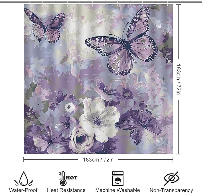 Brebasf Abstract Beautiful Animal Butterfly Shower Curtain Set Bathroom Set Decorative Minimal Rustic Watercolor Boho Purple Floral Butterfly 4 Piece Shower Curtain, Toilet Cover, U-Mat, Floor Mat